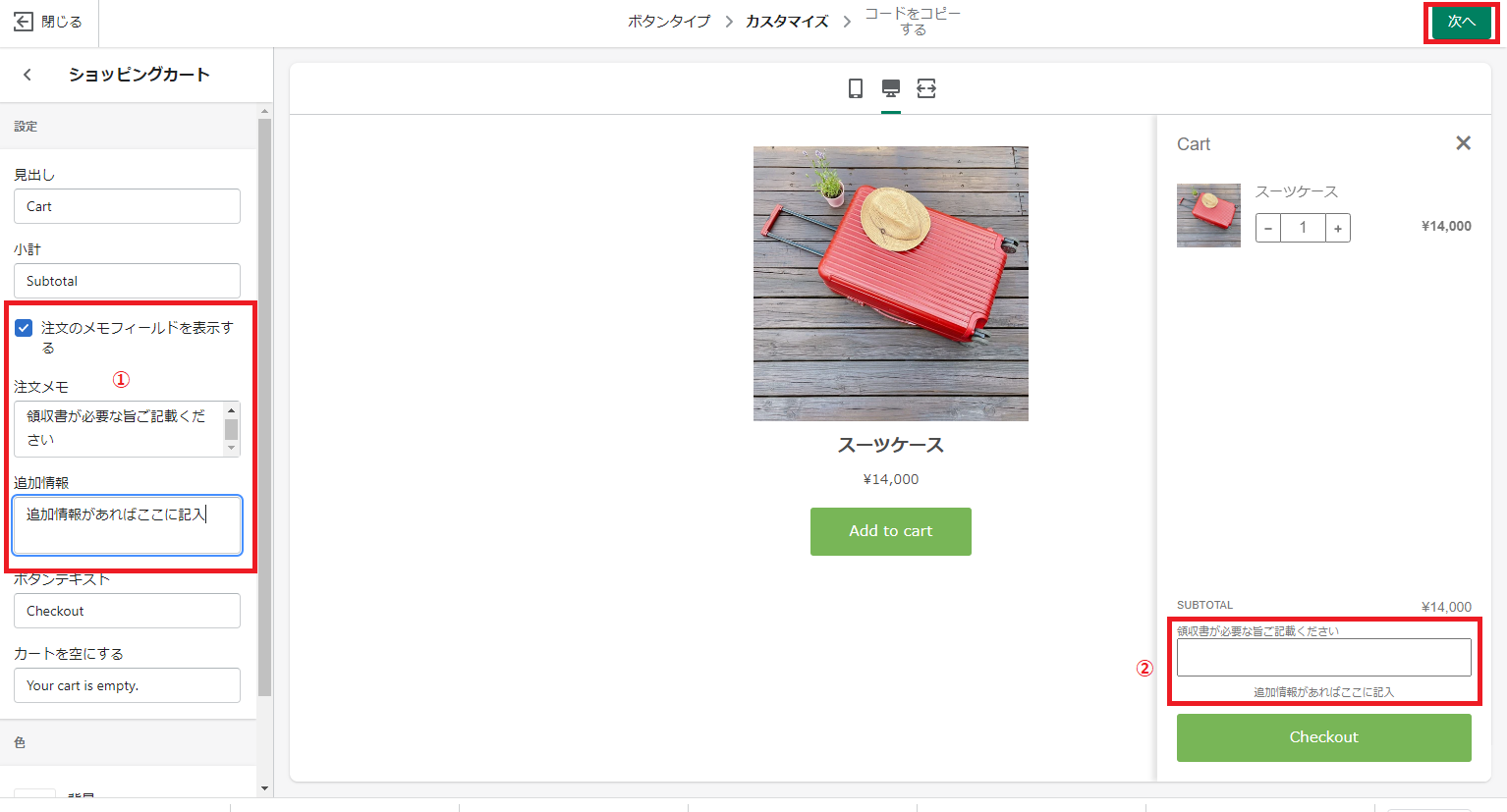 ⑧「注文のメモフィールドに表示する」をチェック ➡ 「注文メモ」に備考欄の内容を記入 ➡ 追加情報があれば記入(①に記載した内容が②の箇所に反映されます)