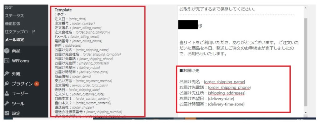 例 お届け先情報を入力したい場合、templateから必要なタグをコピーし、