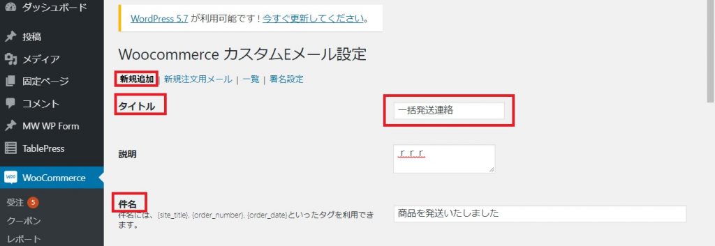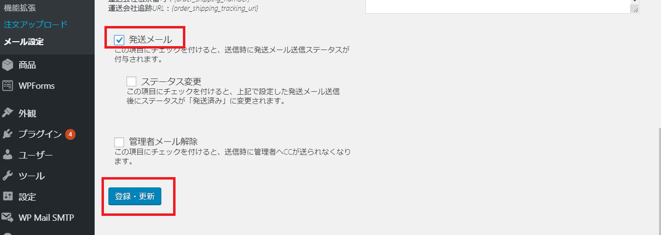④必要な項目を入力したら、必ず発送メールにチェックをいれて、更新を押下する。