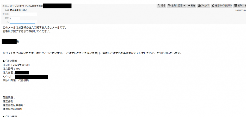 実際に、お客様に届く発送メールは下記のようになります。