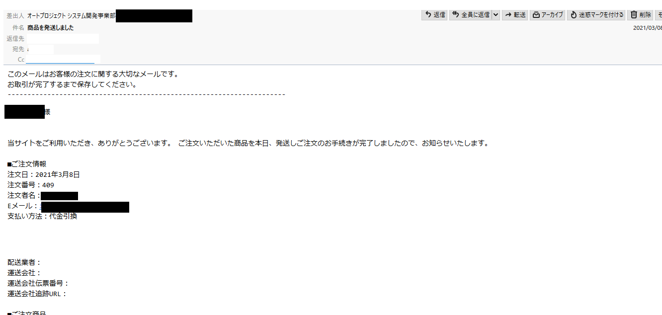 これで、お客様に発送メールが送信されました。