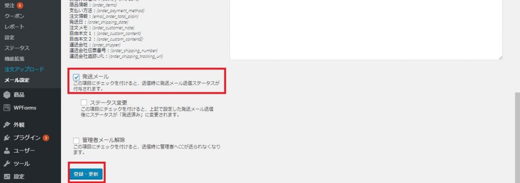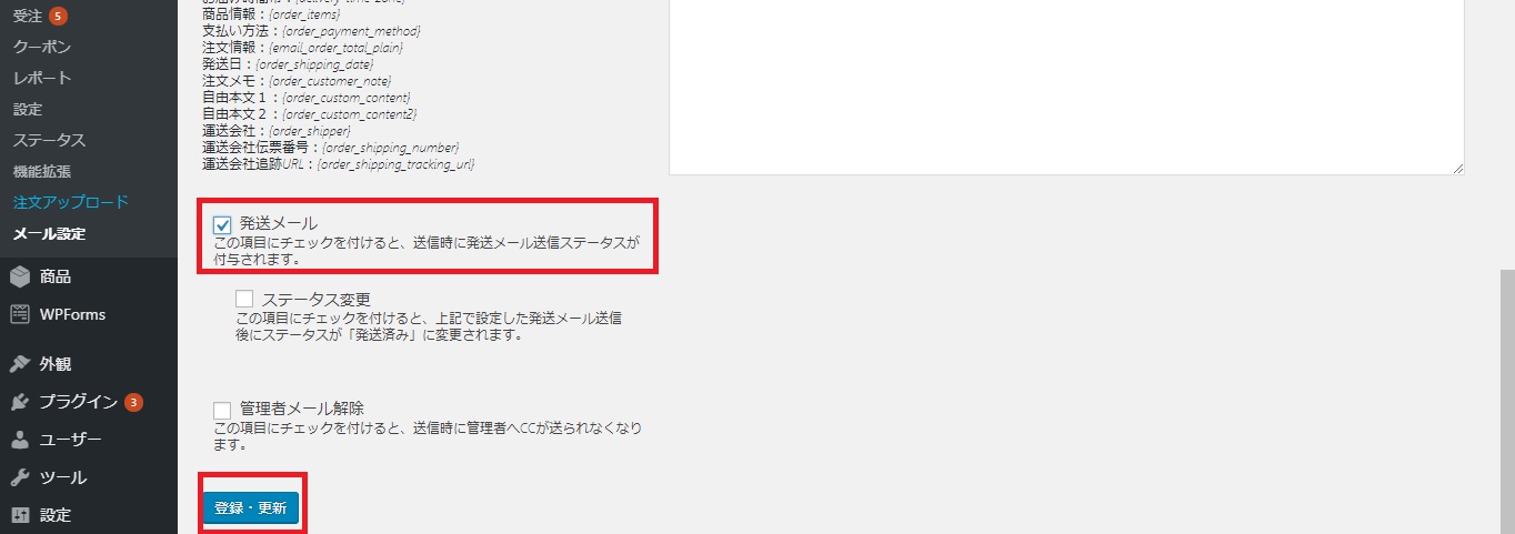 ②入力ができましたら、下記のように、発送メールにチェックをいれて、登録・更新をクリックしてください。