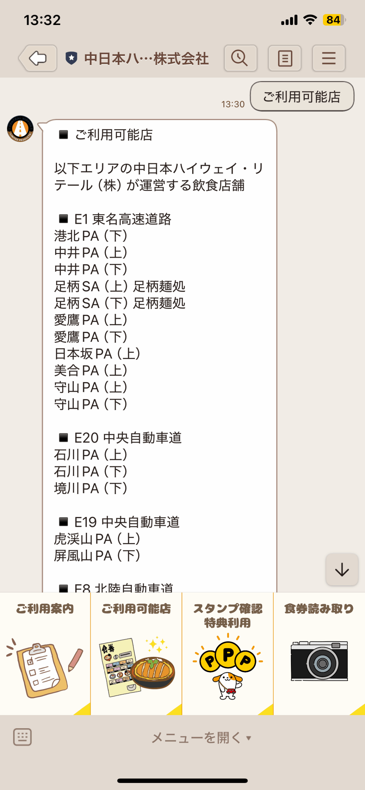中日本ハイウェイ・リテール株式会社 公式LINEアカウントのトーク画面