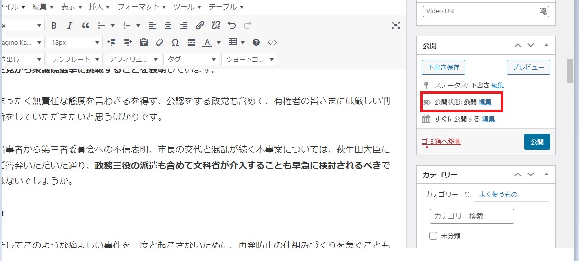 ①投稿一覧→新規追加または、既存の記事→編集をクリック