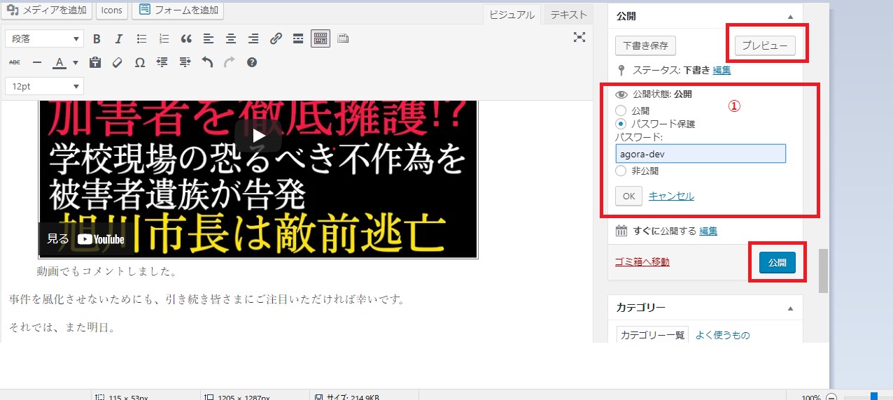 公開または更新を押下。プレビューでパスワード入力画面が表示されているか確認。