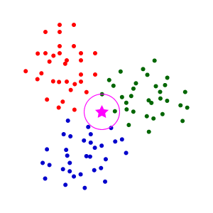 下記のように、赤、青、緑とグループ分けされた状態で、★がどのグループに存在するかを見つける。例えば、最も近い3点から選択するという方法をとる場合、下記の図のように、★印は、緑に属することになる。