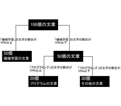 例えば100個の文章ファイルがあって、それを、機械学習、プログラミング、その他 で分けたい場合、下記のようになったとする。