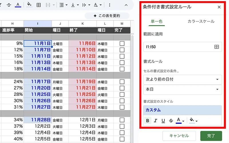 3. 「書式設定のスタイル」で背景色や文字色などを指定して「完了」ボタンをクリック